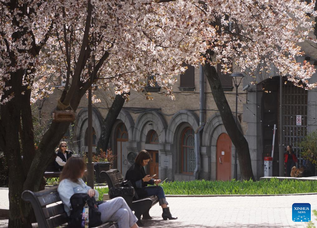 People walk under cherry blossoms in Kiev, Ukraine, April 17, 2025. (Photo by Roman Petushkov/Xinhua)