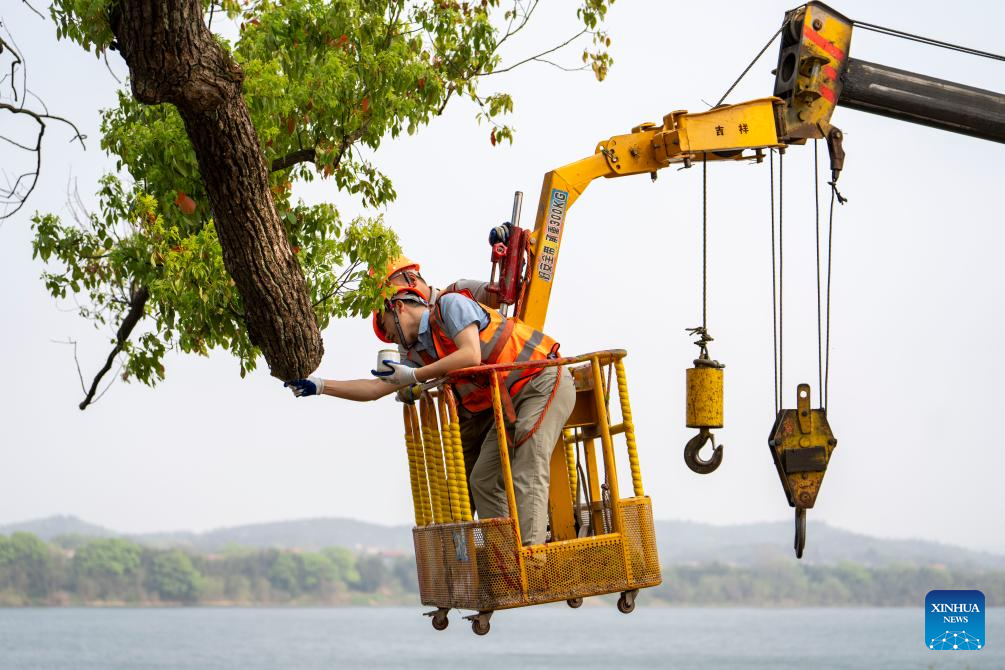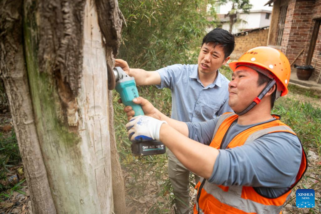 Wu Lei (L), a specialist in ancient tree conservation, instructs a worker to polish the trunk of an injured ancient tree in Xinyuan Village of Hengshan County, Hengyang City, central China's Hunan Province, March 27, 2025.(Xinhua/Zhou Mian)