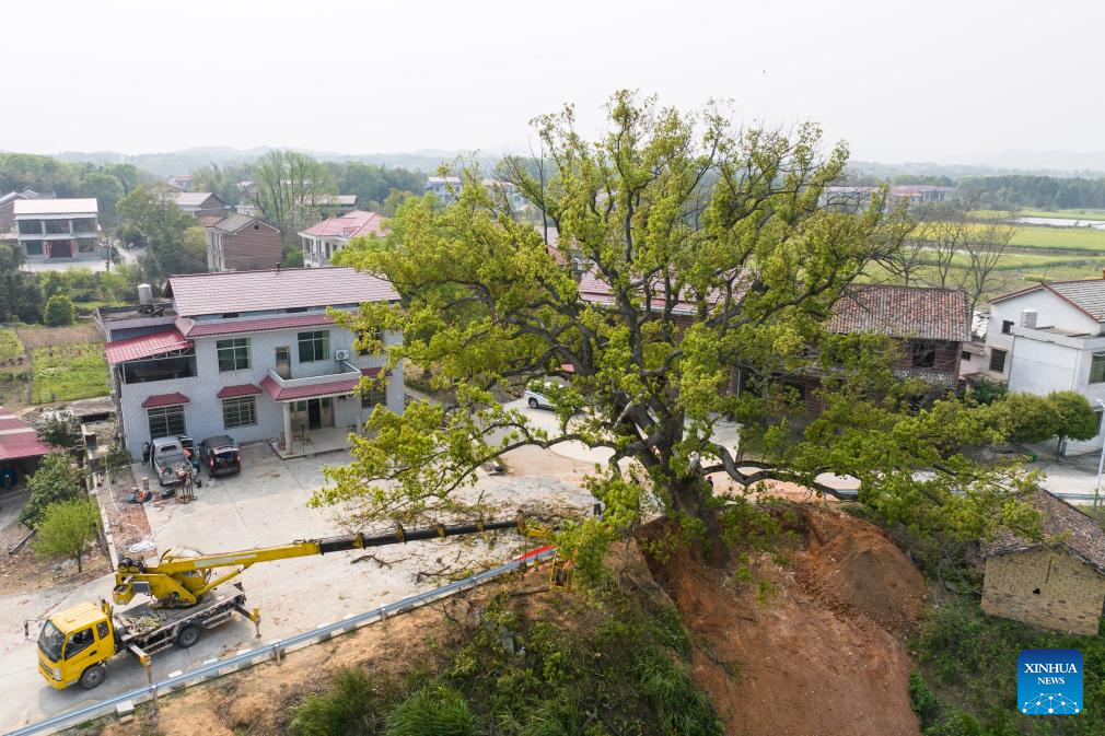 An aerial drone photo taken on March 27, 2025 shows the site of an ancient tree treatment in Xinyuan Village of Hengshan County, Hengyang City, central China's Hunan Province.(Xinhua/Chen Sihan)