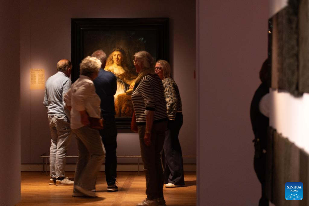 Visitors view artworks during the exhibition "From Rembrandt to Vermeer: Masterpieces from the Leiden Collection" in Amsterdam, the Netherlands, April 17, 2025. Featuring 75 works by 27 artists from the 17th-century Dutch Golden Age, including pieces by Rembrandt van Rijn and Johannes Vermeer, the exhibition runs from April 9 to August 24, 2025. (Photo by Sylvia Lederer/Xinhua)