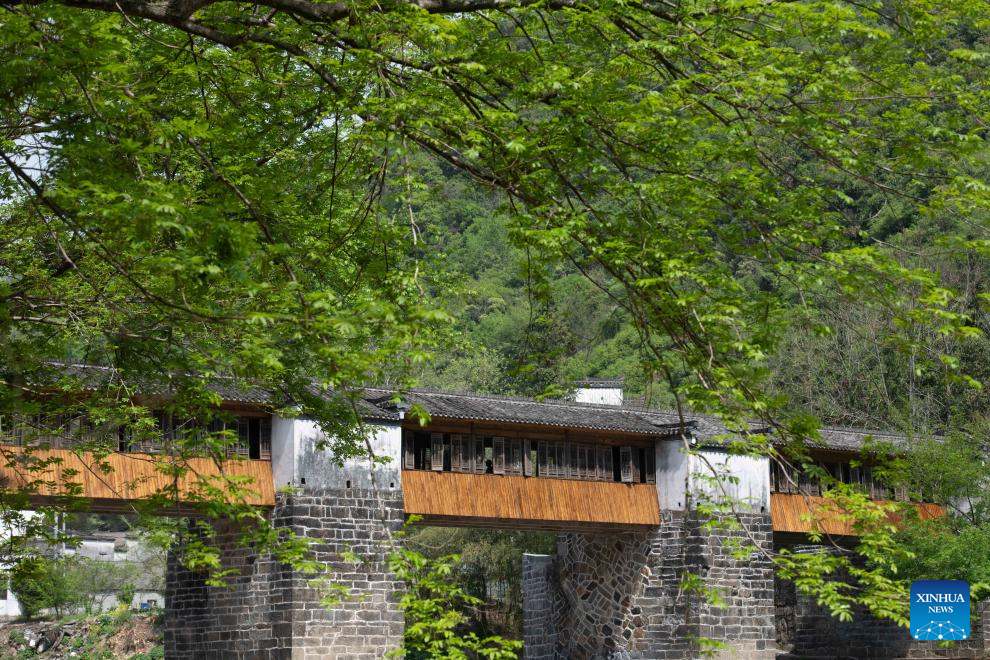 This photo taken on April 11, 2025 shows the Gongbei roofed bridge in Xiuning County of Huangshan City, east China's Anhui Province. Roofed bridge, also called covered bridge, is a unique architectural structure in Huangshan City. These ingeniously structured and elegantly shaped bridges carry rich cultural significance and form a distinctive part of Huizhou culture.