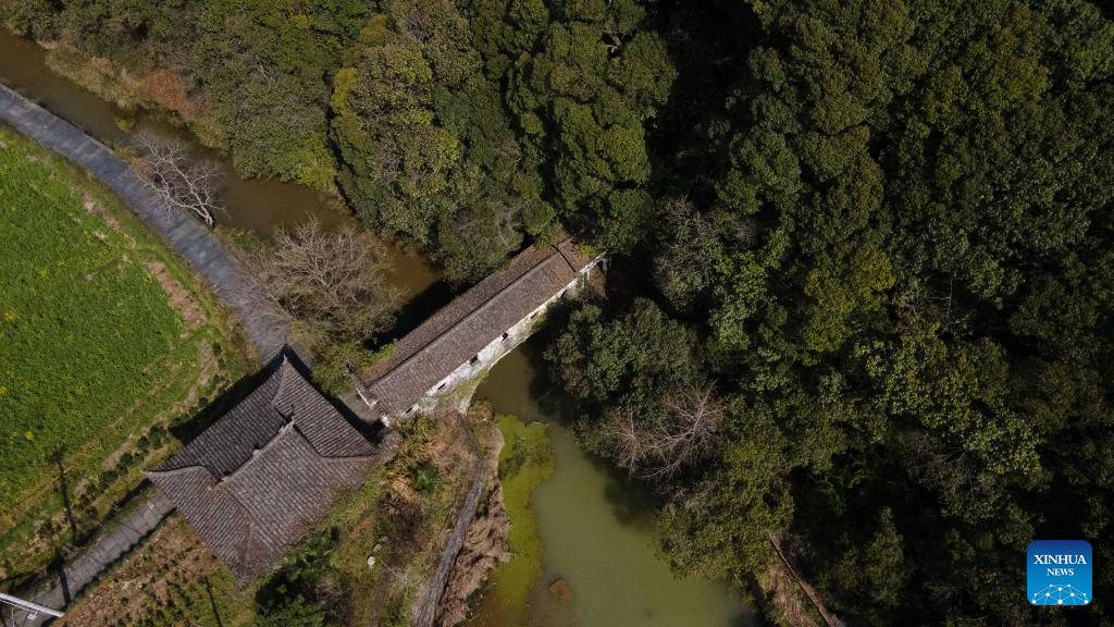 An aerial drone photo taken on March 24, 2025 shows the Shuizhukeng roofed bridge in Shexian County of Huangshan City, east China's Anhui Province. Roofed bridge, also called covered bridge, is a unique architectural structure in Huangshan City. These ingeniously structured and elegantly shaped bridges carry rich cultural significance and form a distinctive part of Huizhou culture.