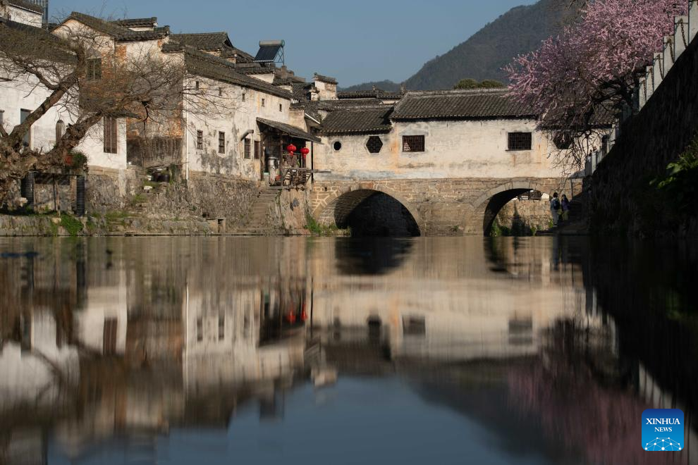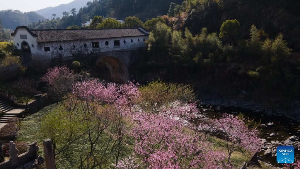 This photo taken on March 26, 2025 shows the Sankeshu roofed bridge in Xiuning County of Huangshan City, east China's Anhui Province. Roofed bridge, also called covered bridge, is a unique architectural structure in Huangshan City. These ingeniously structured and elegantly shaped bridges carry rich cultural significance and form a distinctive part of Huizhou culture.