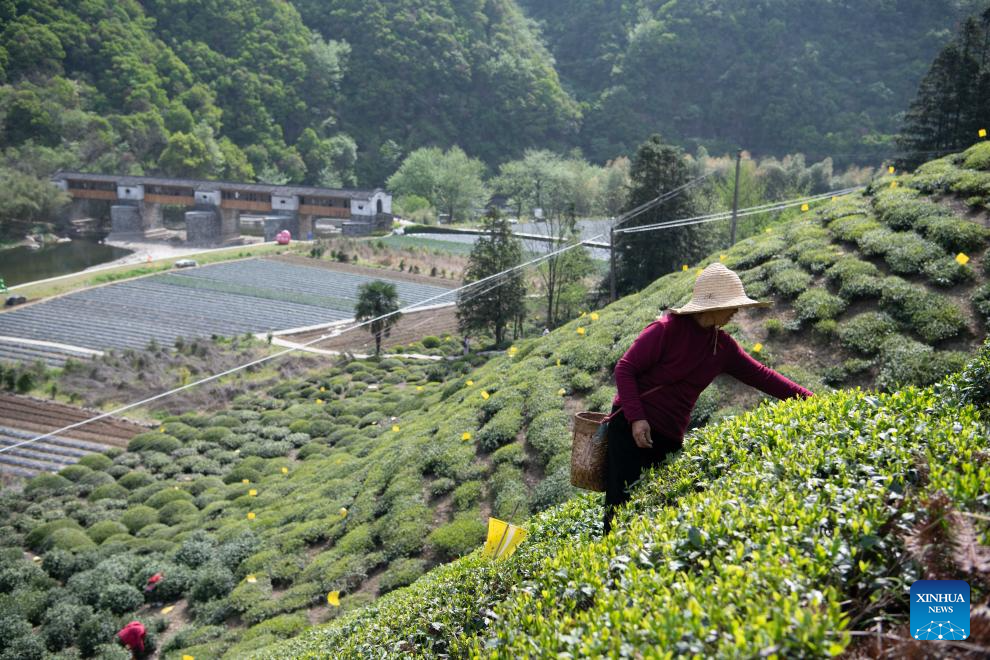 A farmer picks tea leaves at a tea garden near the Gongbei roofed bridge (L, upper) in Xiuning County of Huangshan City, east China's Anhui Province, April 11, 2025. Roofed bridge, also called covered bridge, is a unique architectural structure in Huangshan City. These ingeniously structured and elegantly shaped bridges carry rich cultural significance and form a distinctive part of Huizhou culture.