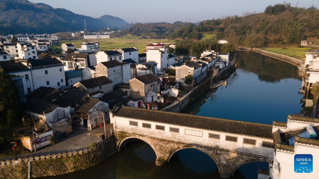 An aerial drone photo taken on March 24, 2025 shows the Bei'an roofed bridge and the scenery of surrounding areas in Shexian County of Huangshan City, east China's Anhui Province. Roofed bridge, also called covered bridge, is a unique architectural structure in Huangshan City. These ingeniously structured and elegantly shaped bridges carry rich cultural significance and form a distinctive part of Huizhou culture.