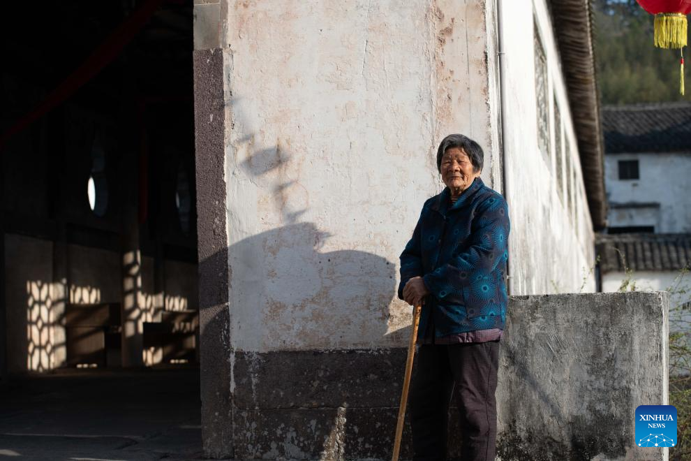 A resident stands in front of the Bei'an roofed bridge in Shexian County of Huangshan City, east China's Anhui Province, March 24, 2025. Roofed bridge, also called covered bridge, is a unique architectural structure in Huangshan City. These ingeniously structured and elegantly shaped bridges carry rich cultural significance and form a distinctive part of Huizhou culture.