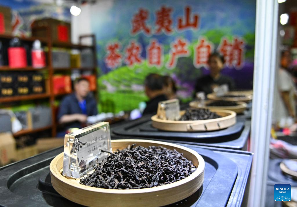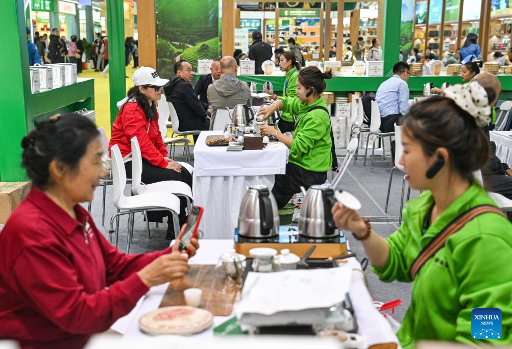 This photo taken on April 18, 2025 shows tea products exhibited during the 18th Beijing International Tea and Tea Ceremony Exhibition at the China Agricultural Exhibition Center in Beijing, capital of China. The four-day Beijing International Tea and Tea Ceremony Exhibition kicked off in Beijing on Friday, attracting exhibitors from more than 700 tea-related enterprises. (Xinhua/Chen Yehua)