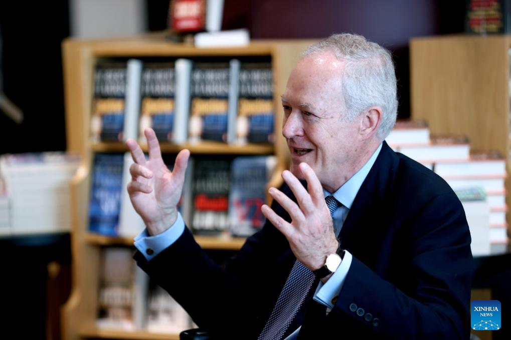James Daunt, the managing director of Waterstones, speaks during an interview at Waterstones' flagship store in London, Britain, on April 17, 2025. From high-end urban streets to picturesque suburbs, Waterstones stands as one of Britain's most iconic bookstore brands. Yet only a decade ago, it was on the brink of bankruptcy, squeezed by the menacing rise of e-reading. Its revival is largely credited to one man who remains steadfast in his mantra -- placing the right bookstore in the right place. (Xinhua/Li Ying)