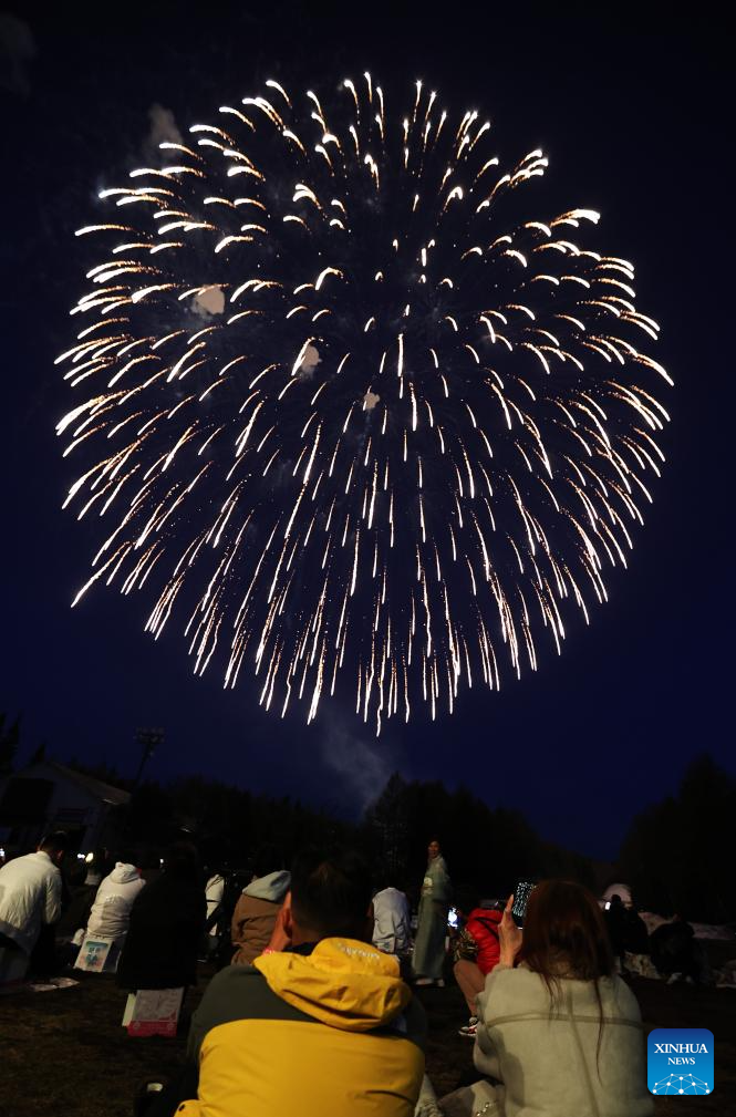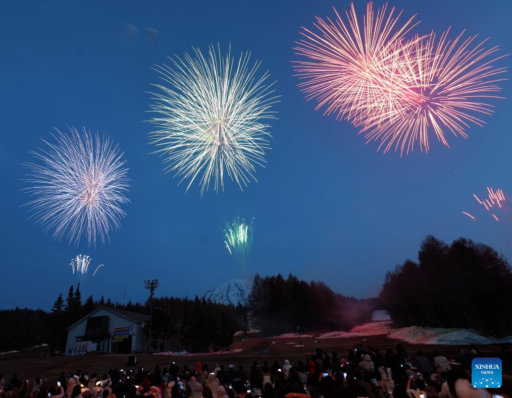 People watch fireworks during a fireworks show held at the foot of Mount Fuji in Yamanashi, Japan, April 19, 2025. (Xinhua/Jia Haocheng)