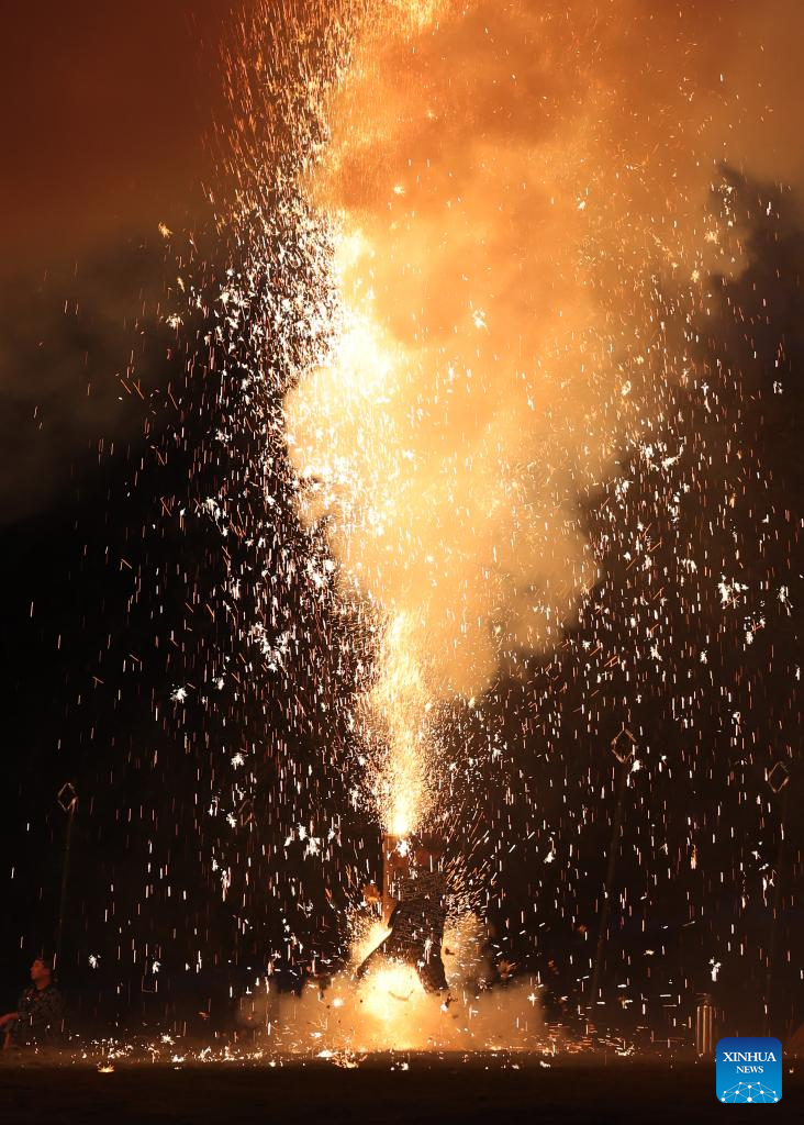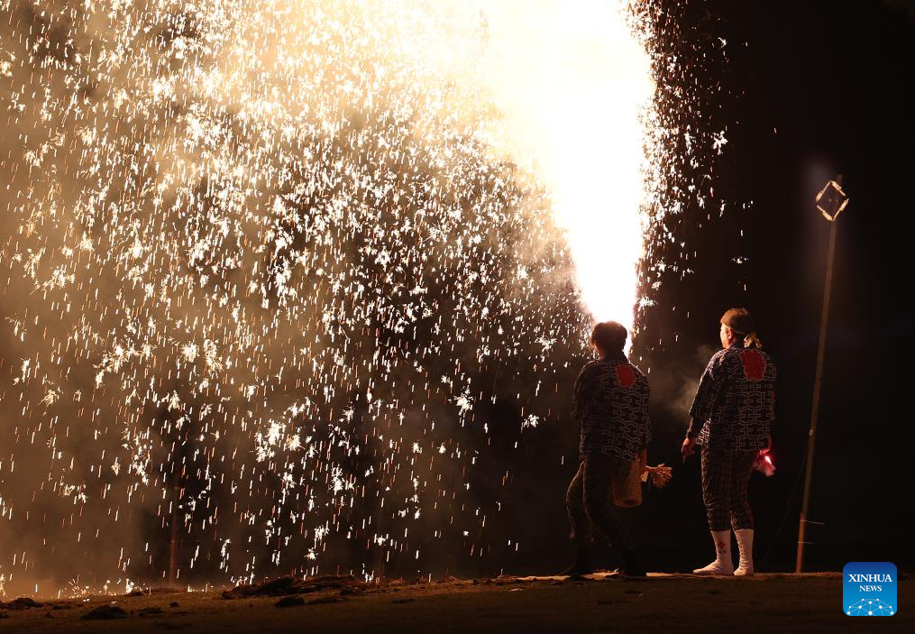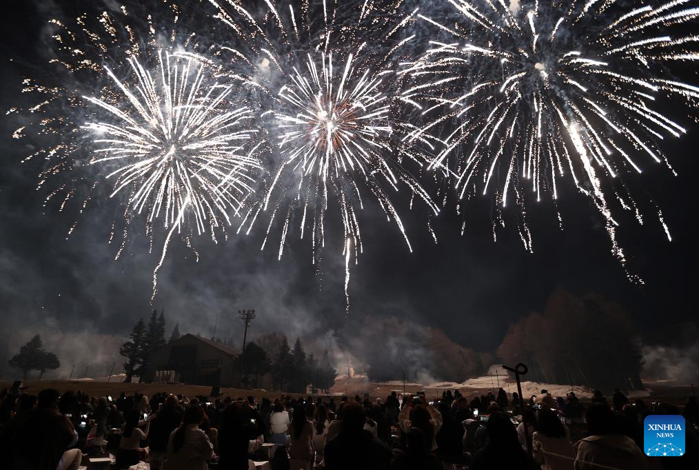 Firework artists showcase fireworks during a fireworks show held at the foot of Mount Fuji in Yamanashi, Japan, April 19, 2025. (Xinhua/Jia Haocheng)