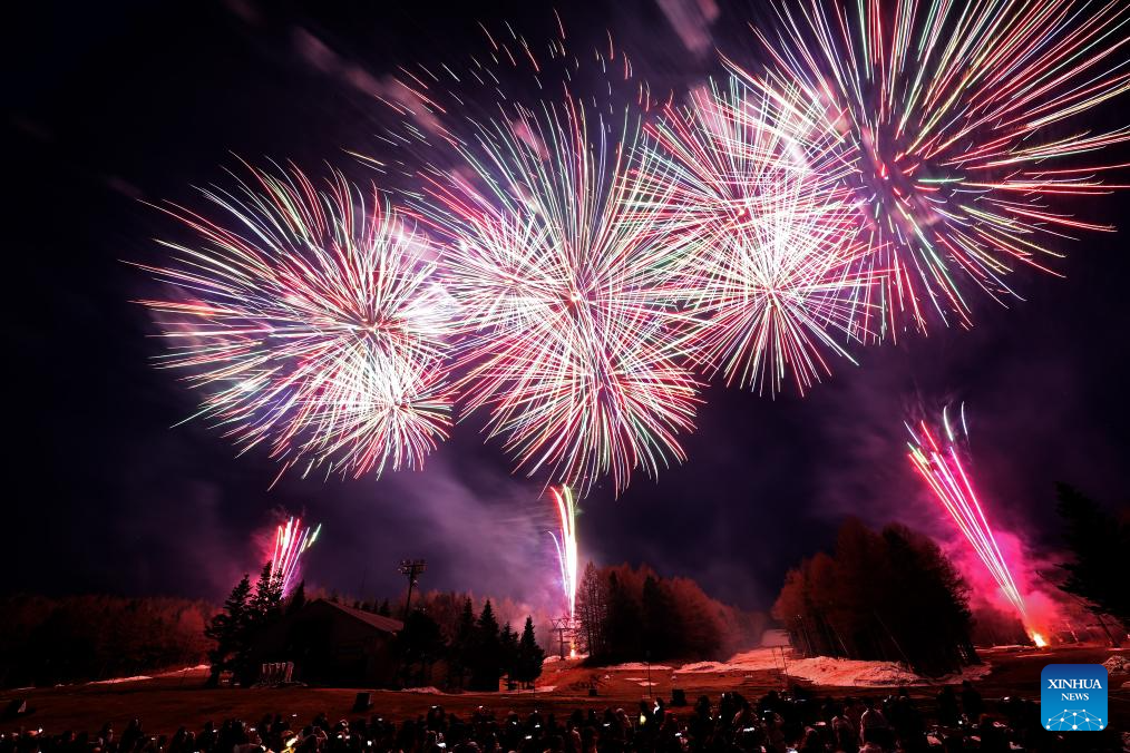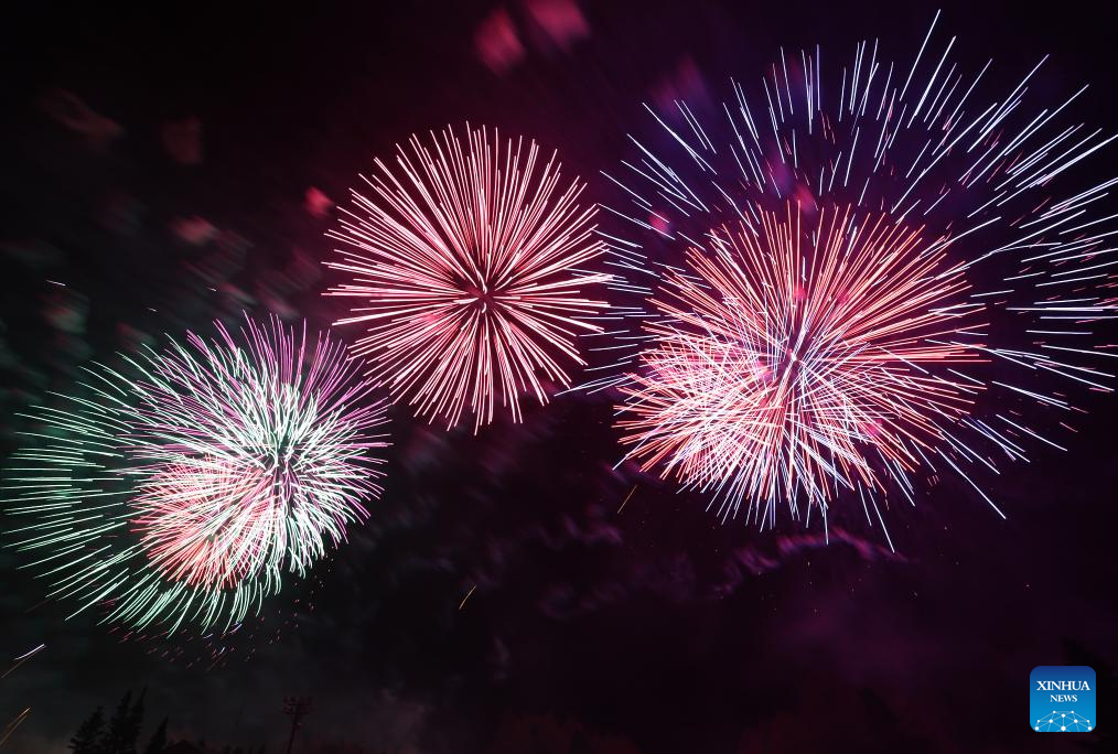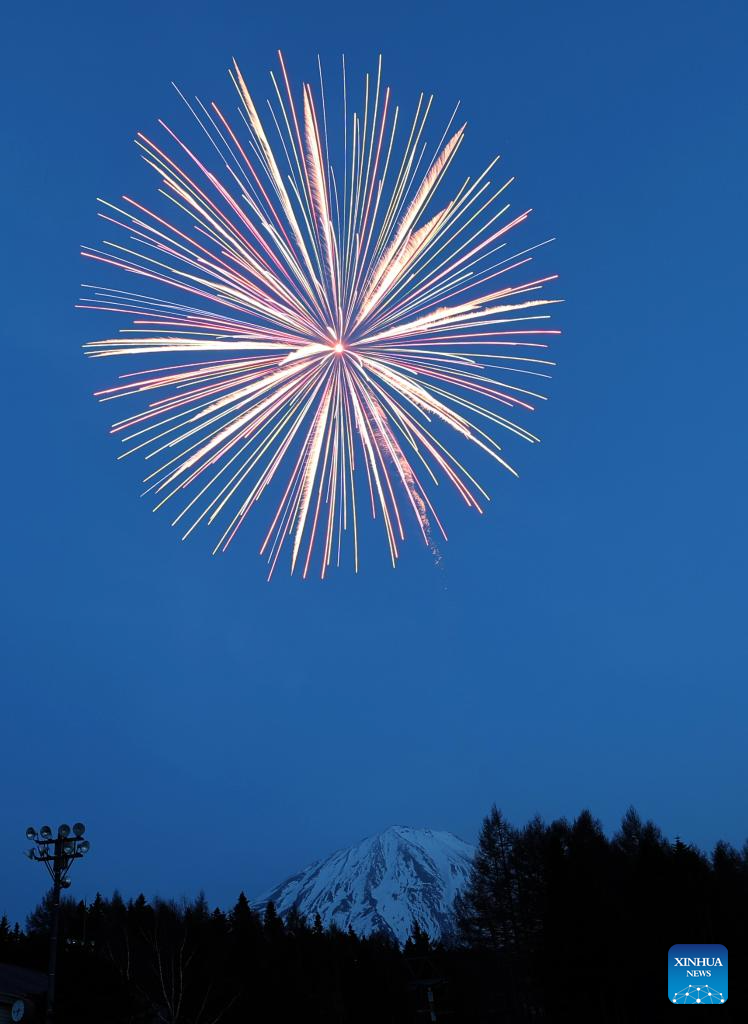 Fireworks light up the sky during a fireworks show held at the foot of Mount Fuji in Yamanashi, Japan, April 19, 2025. (Xinhua/Jia Haocheng)