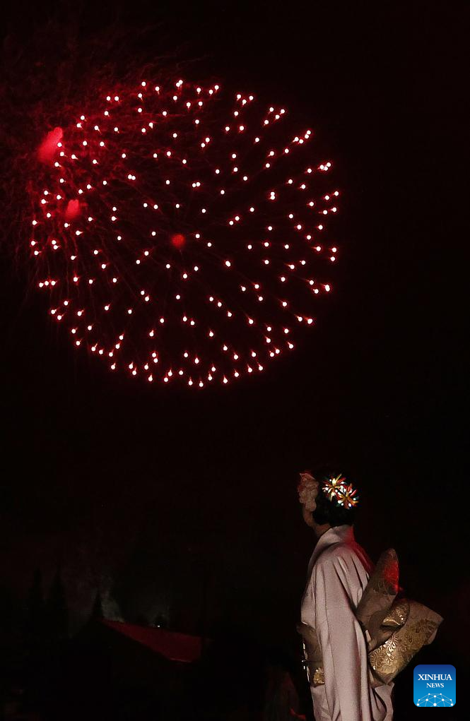 A woman watches fireworks during a fireworks show held at the foot of Mount Fuji in Yamanashi, Japan, April 19, 2025. (Xinhua/Jia Haocheng)