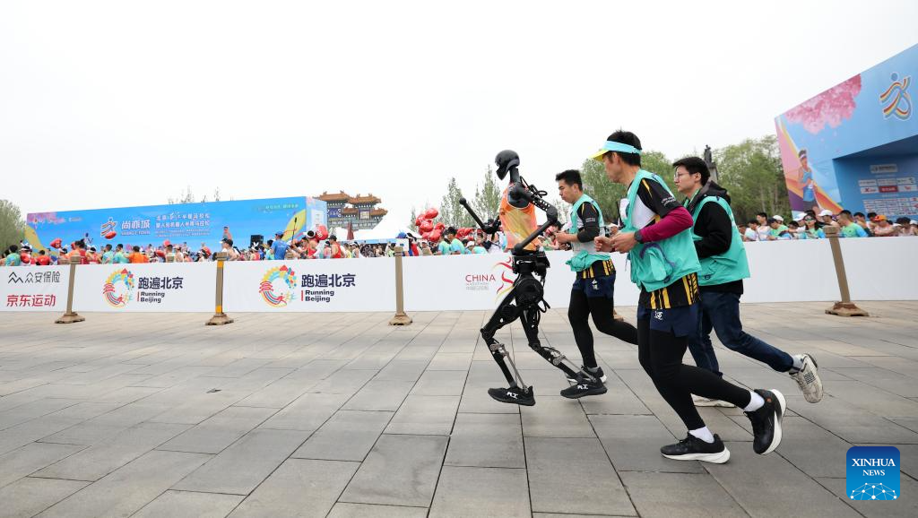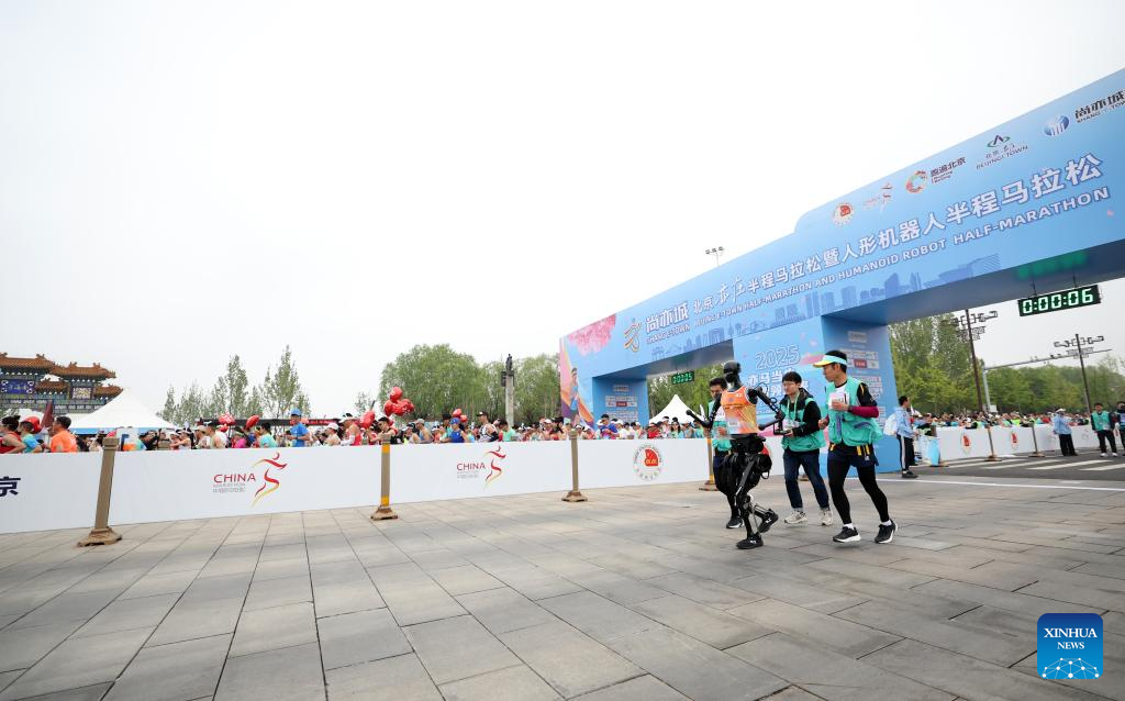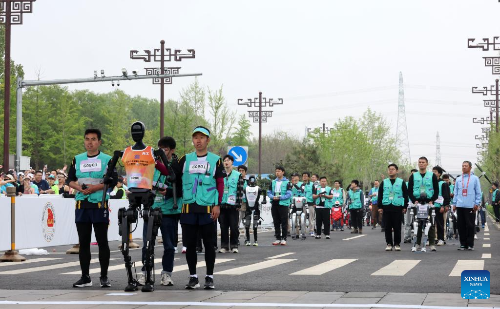 Robotic and human participants compete during the Beijing E-Town half-marathon and humanoid robots half-marathon in the Beijing Economic-Technological Development Area in southeast Beijing, China, April 19, 2025. (Xinhua/Cao Can)