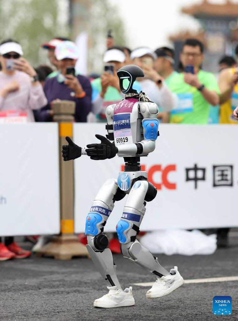 Robotic participant "0306 Xiaojuren" waves during the Beijing E-Town half-marathon and humanoid robots half-marathon in the Beijing Economic-Technological Development Area in southeast Beijing, China, April 19, 2025. (Xinhua/Zhang Chenlin)