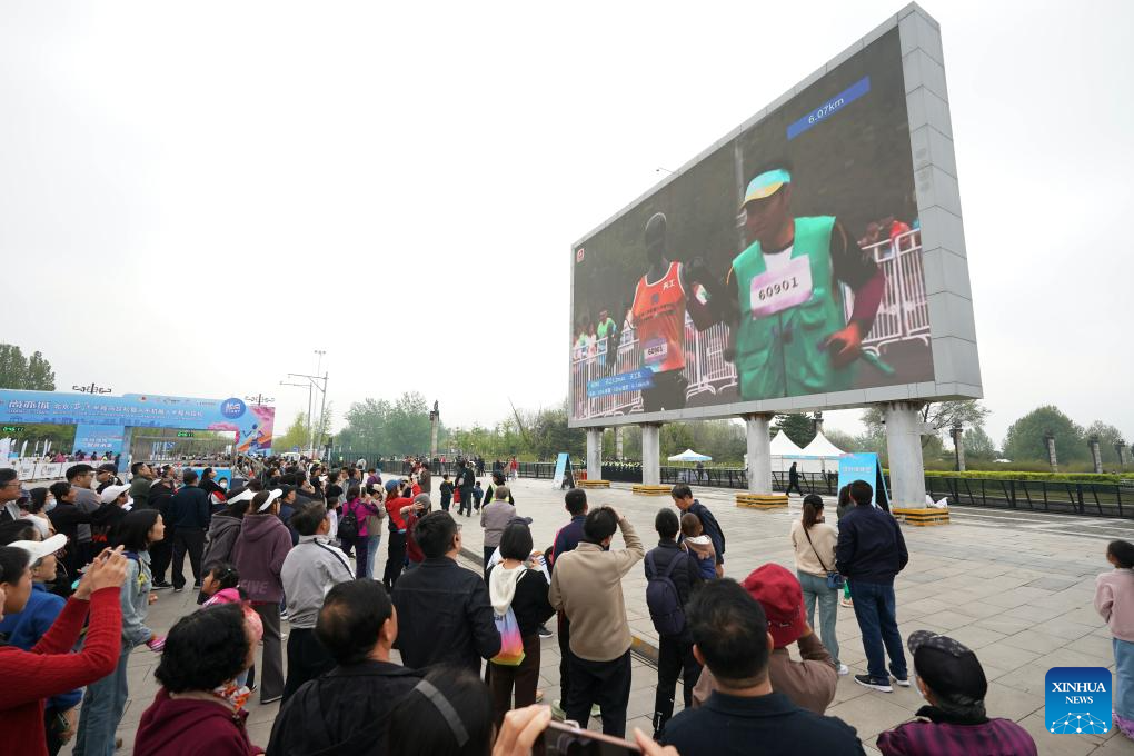 People watches the Beijing E-Town half-marathon and humanoid robots half-marathon in the Beijing Economic-Technological Development Area in southeast Beijing, China, April 19, 2025. (Xinhua/Zhang Chenlin)