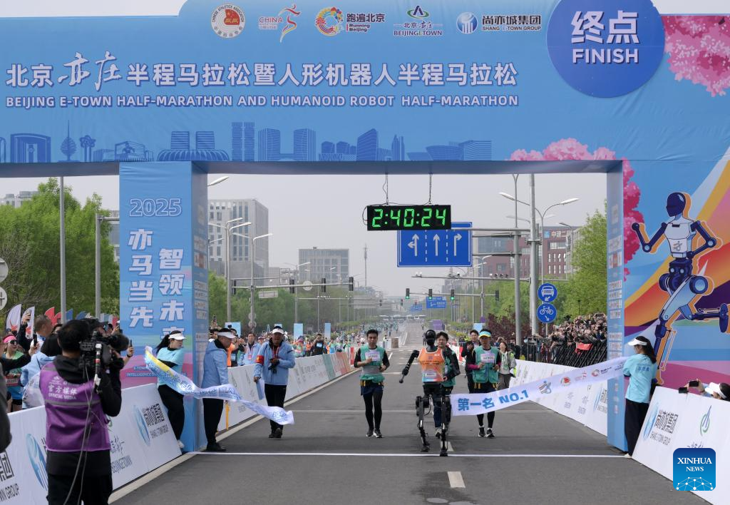 Elias Desta of Ethiopia crosses the finishing line during the Beijing E-Town half-marathon and humanoid robots half-marathon in the Beijing Economic-Technological Development Area in southeast Beijing, April 19, 2025. (Xinhua/Li He)