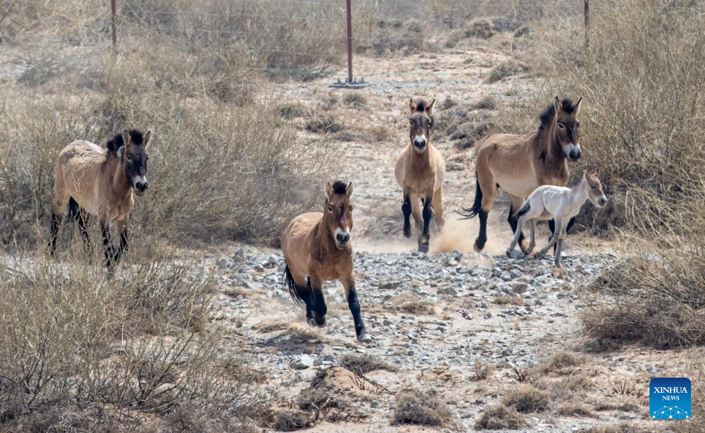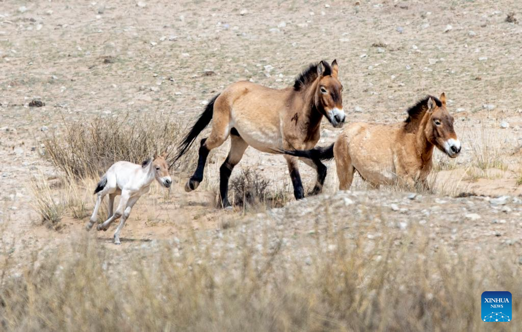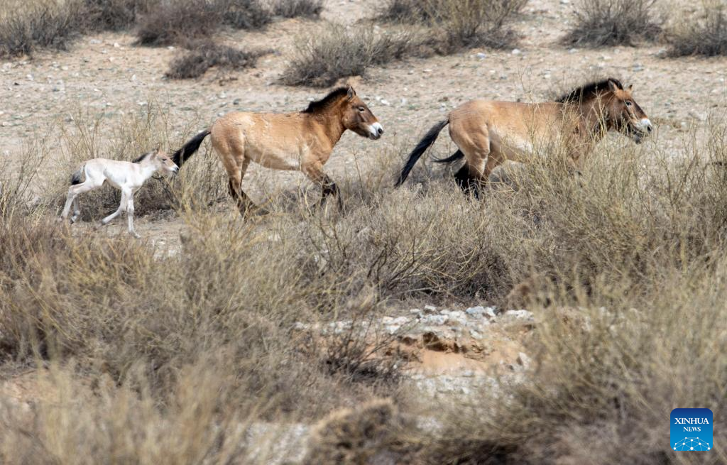 Przewalski's horses and a foal are seen at the Helan Mountain Nature Reserve in northwest China's Ningxia Hui Autonomous Region, April 17, 2025. The Przewalski's horse is listed as endangered by the International Union for Conservation of Nature Red List of Threatened Species and is under first-class national protection.