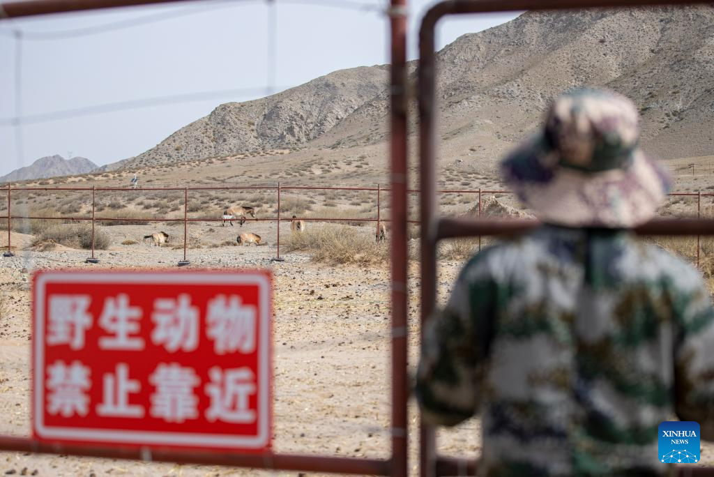 A staff member checks the Przewalski's horses at the Helan Mountain Nature Reserve in northwest China's Ningxia Hui Autonomous Region, April 17, 2025. The Przewalski's horse is listed as endangered by the International Union for Conservation of Nature Red List of Threatened Species and is under first-class national protection.