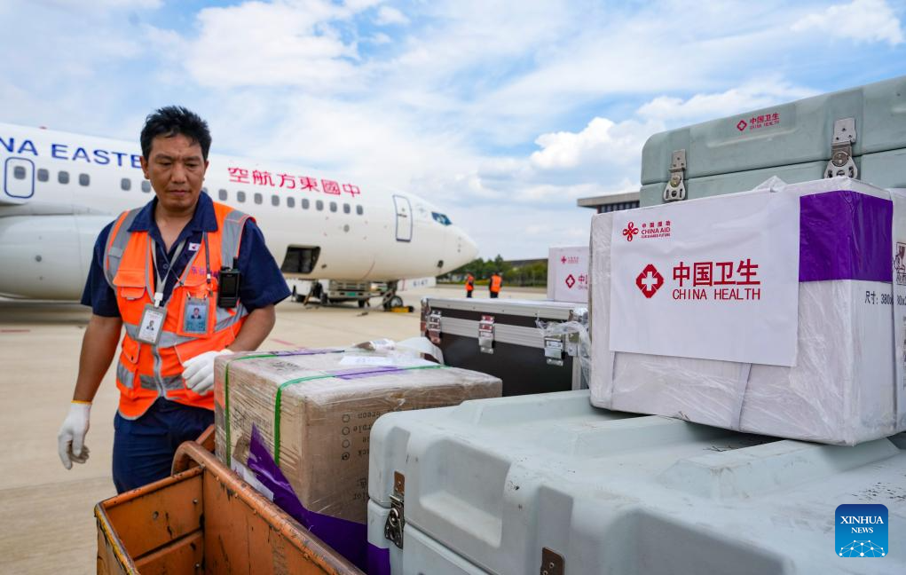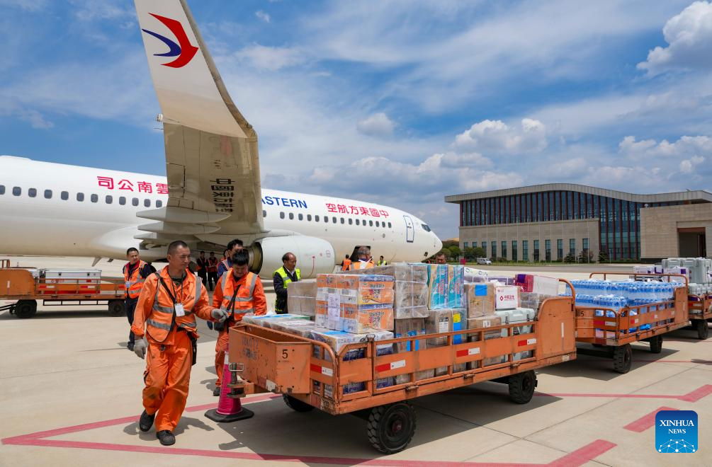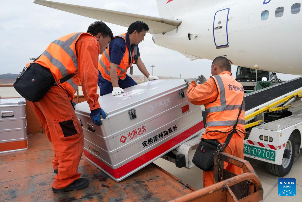 Staff members load public health supplies at the Kunming Changshui International Airport in Kunming, southwest China's Yunnan Province, April 19, 2025. A 50-member Chinese public health team departed for Myanmar on Saturday to support post-earthquake public health efforts there.