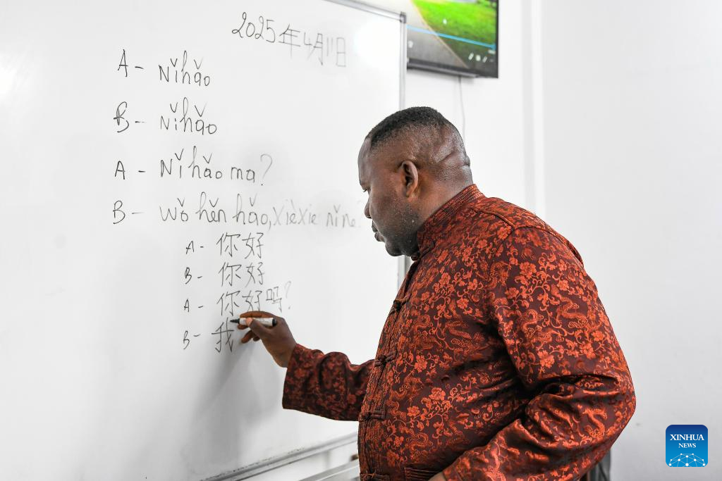Celestin Alexis Nono writes Chinese words on the board to teach his students in Yaounde, capital of Cameroon, April 11, 2025. (Xinhua/Kepseu)