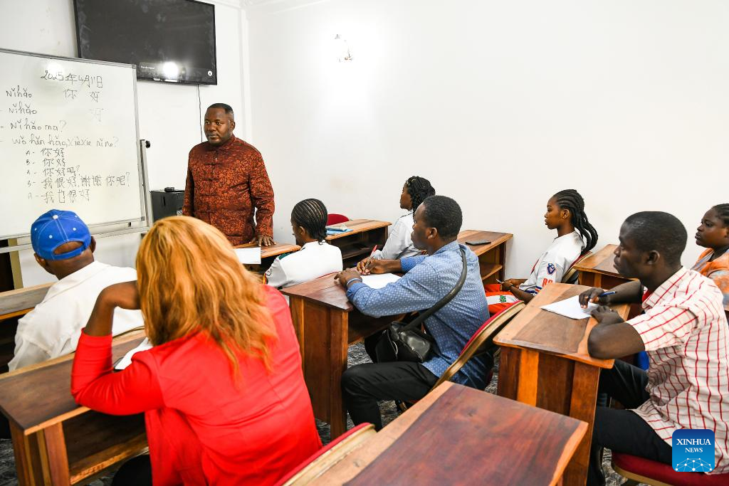 Celestin Alexis Nono (back) teaches his students Chinese in Yaounde, capital of Cameroon, April 11, 2025. (Xinhua/Kepseu)