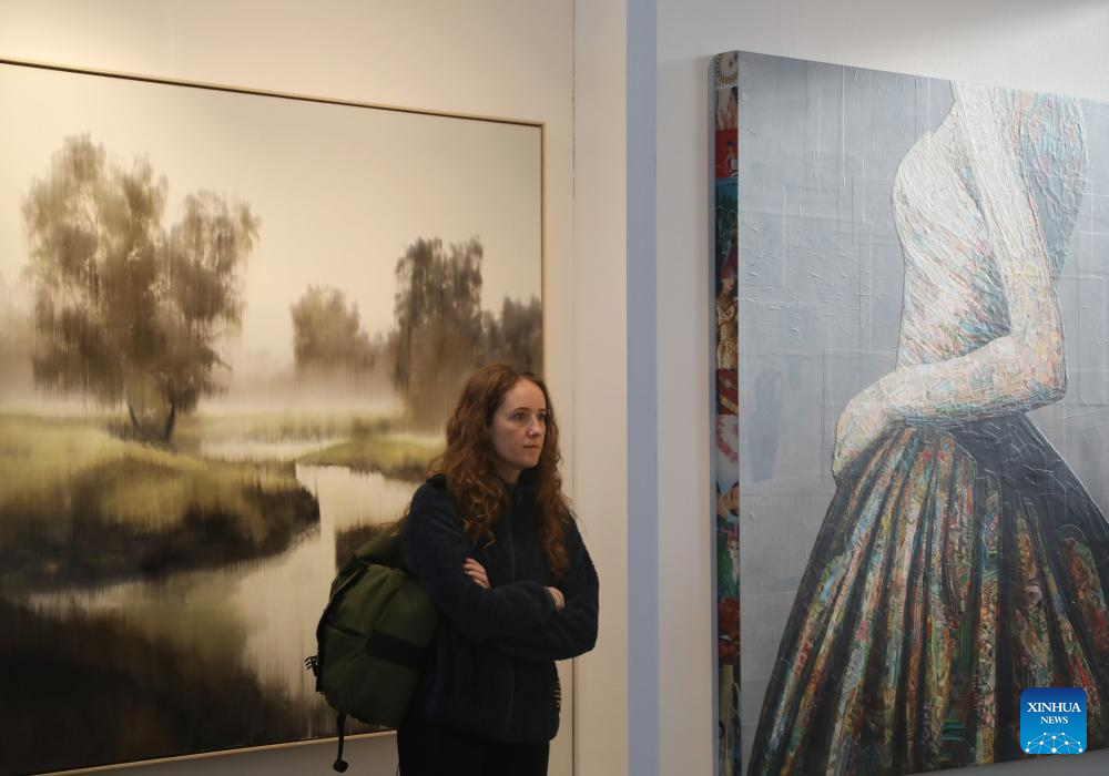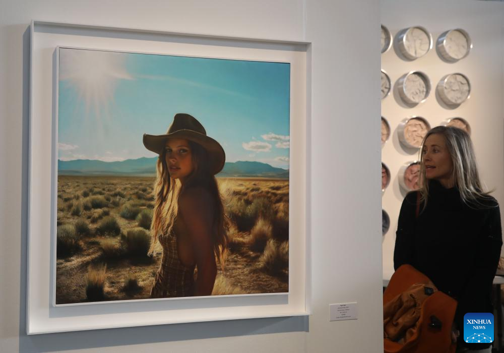 A visitor views artworks at the San Francisco Art Fair at Fort Mason Center in San Francisco, the United States, April 19, 2024. The art fair opens to the public from April 18 to April 20 this year. (Photo by Liu Yilin/Xinhua)
