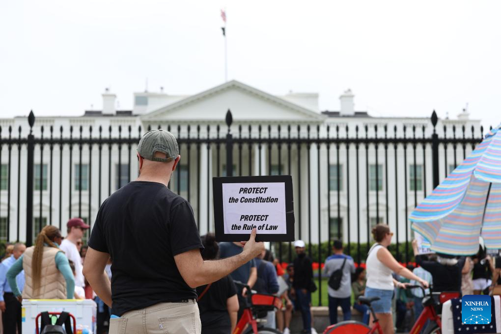 Protesters gather during a rally outside the White House in Washington, D.C., the United States, April 19, 2025. Thousands of protesters on Saturday took to the streets in various cities across the United States in what demonstrators described as part of a "National Day of Action" against President Donald Trump's policies and perceived threats to democracy. (Xinhua/Hu Yousong)