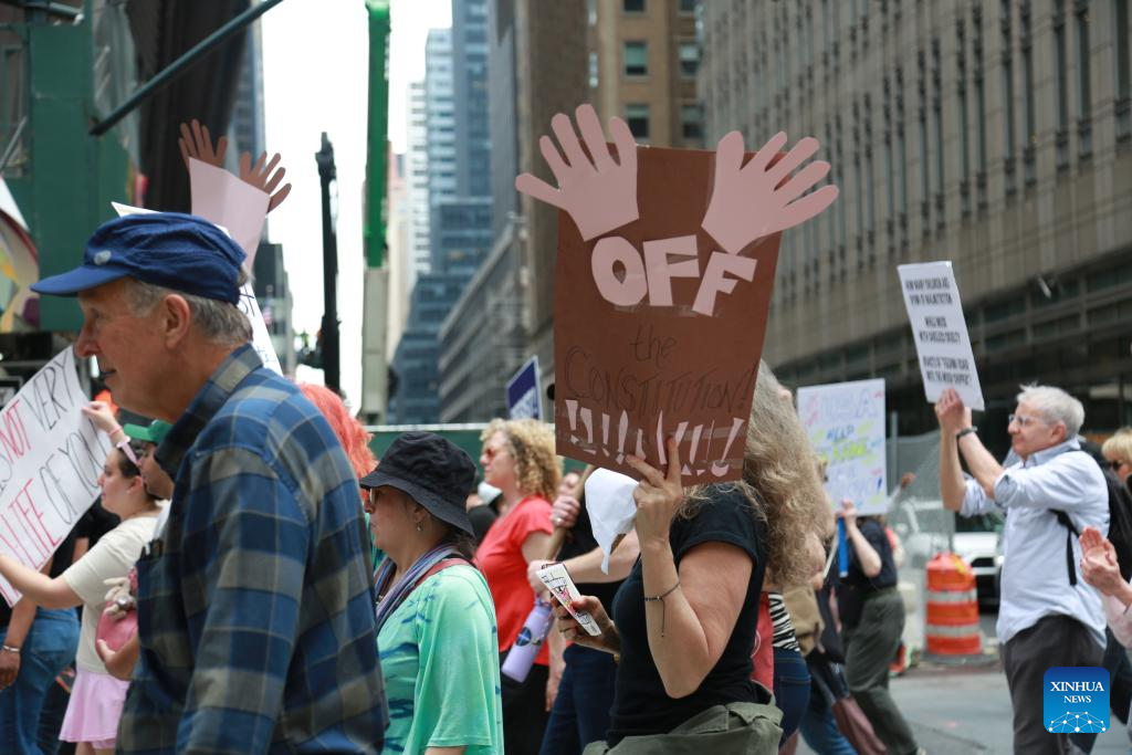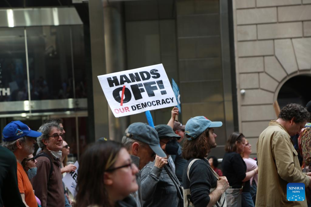(250420) -- NEW YORK, April 20, 2025 (Xinhua) -- Demonstrators participate in a rally and march in protest of the Donald Trump administration's policies in New York City, the United States, on April 19, 2025. Thousands of protesters on Saturday took to the streets in various cities across the United States in what demonstrators described as part of a "National Day of Action" against President Donald Trump's policies and perceived threats to democracy. (Xinhua/Liu Yanan)