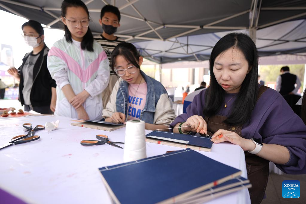 Citizens experience traditional Chinese stiched bookbinding during a civil reading event in Yinchuan, northwest China's Ningxia Hui Autonomous Region, April 20, 2025. The event was held here on Sunday to raise awareness of reading among the public. (Xinhua/Wang Peng)