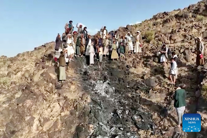 This video screenshot provided by the Houthi media outlets shows Yemeni villagers checking the wreckage of the U.S. MQ-9 drone in Sanaa province, Yemen, April 19, 2025. Yemen's Houthi group said Saturday it shot down another U.S.-made MQ-9 drone over Sanaa province in the past 24 hours. (Xinhua)