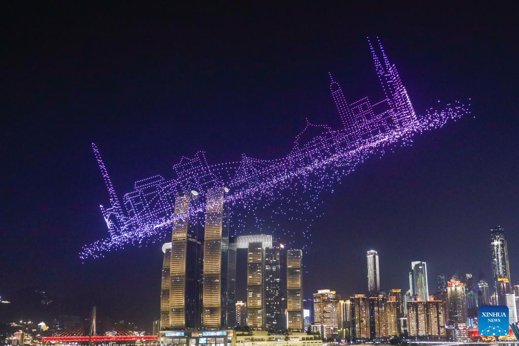 A drone light show is pictured in Nan'an District of southwest China's Chongqing Municipality, April 19, 2025. The 15-minute drone light show, which features iconic city landmarks of Chongqing, made its debut on Saturday, presenting a visual feast along with a city lighting display.