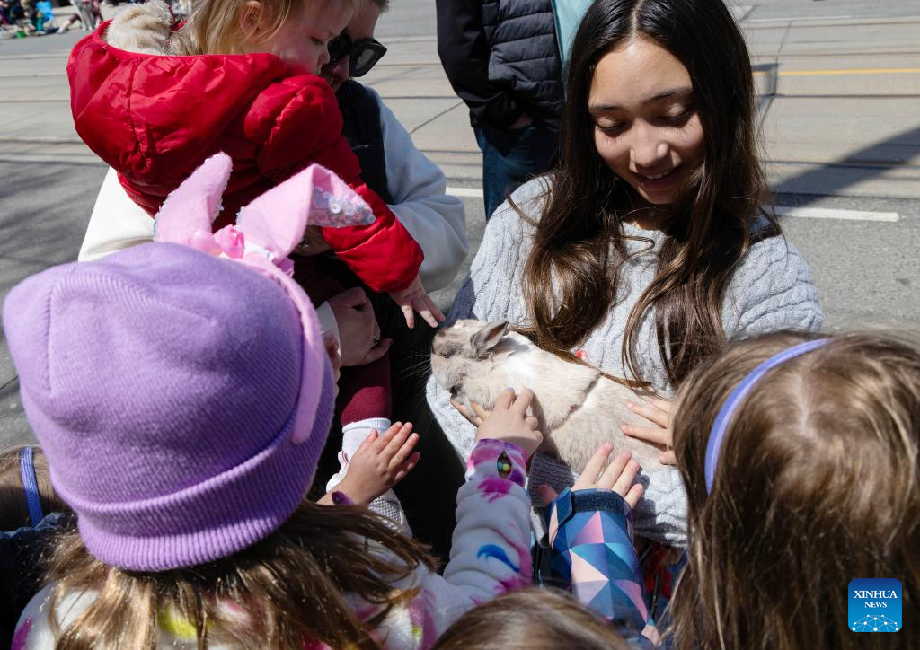 Children pet a rabbit during the 2025 Toronto Beaches Lions Easter Parade in Toronto, Canada, on April 20, 2025. (Photo by Zou Zheng/Xinhua)