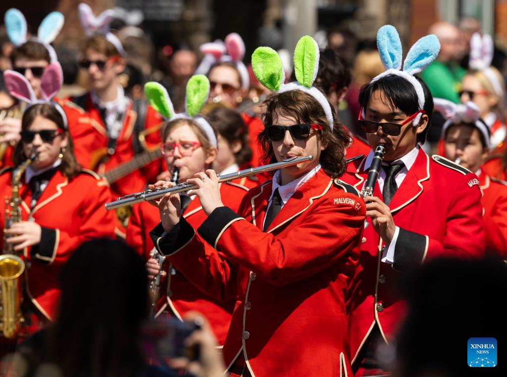 A band wearing bunny ear headbands performs during the 2025 Toronto Beaches Lions Easter Parade in Toronto, Canada, April 20, 2025. (Photo by Zou Zheng/Xinhua)
