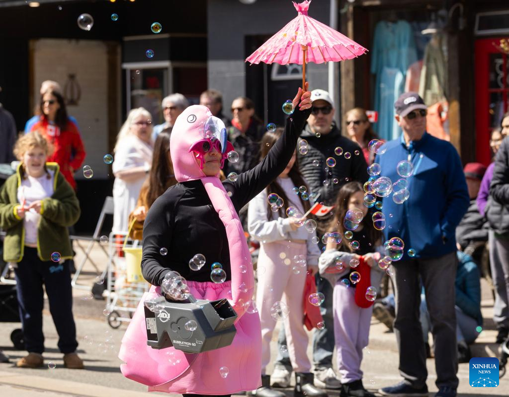 A reveller dressed as a flamingo performs during the 2025 Toronto Beaches Lions Easter Parade in Toronto, Canada, April 20, 2025. (Photo by Zou Zheng/Xinhua)