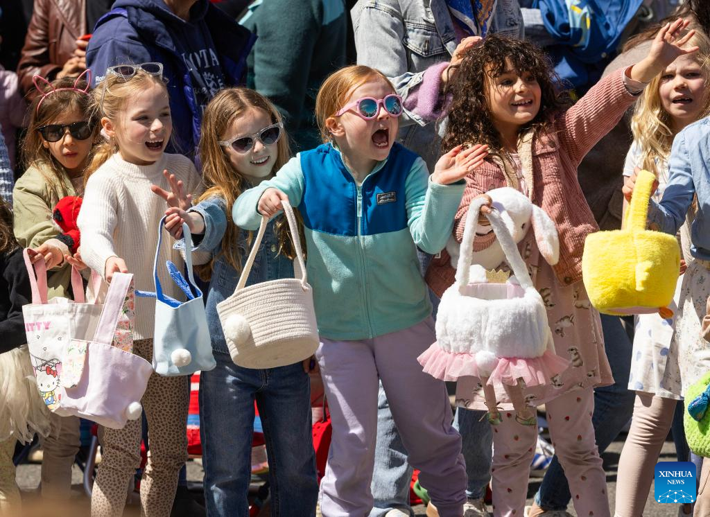 Children wait for candy distribution during the 2025 Toronto Beaches Lions Easter Parade in Toronto, Canada, April 20, 2025. (Photo by Zou Zheng/Xinhua)