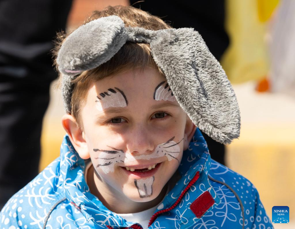 A boy wearing a bunny ear headband and makeup is pictured during the 2025 Toronto Beaches Lions Easter Parade in Toronto, Canada, April 20, 2025. (Photo by Zou Zheng/Xinhua)
