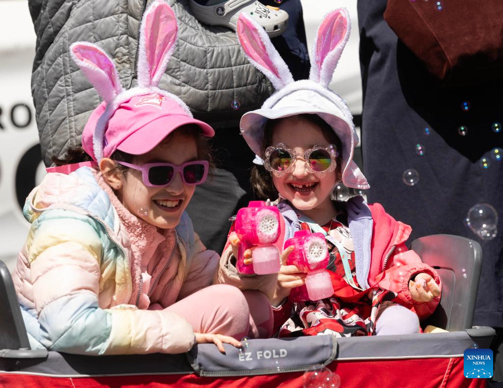 Children wearing bunny ear headbands play with bubble machines during the 2025 Toronto Beaches Lions Easter Parade in Toronto, Canada, April 20, 2025. (Photo by Zou Zheng/Xinhua)