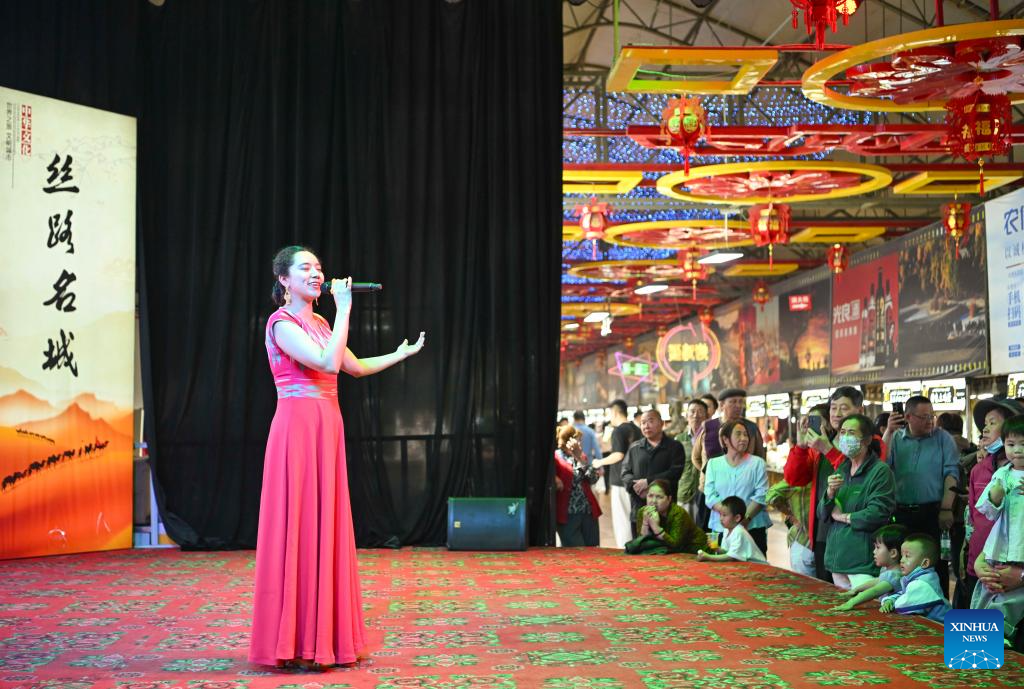 Nurbiye Jureait stages a performance at the night market in Hotan, northwest China's Xinjiang Uygur Autonomous Region, April 15, 2025. The Hotan night market in Xinjiang, which integrates food, entertainment, and cultural features, is a popular destination for tourists. The Hotan cultural troupe holds artistic performances all year round at the night market to enhance the cultural life and tourism experience of local residents and visitors.