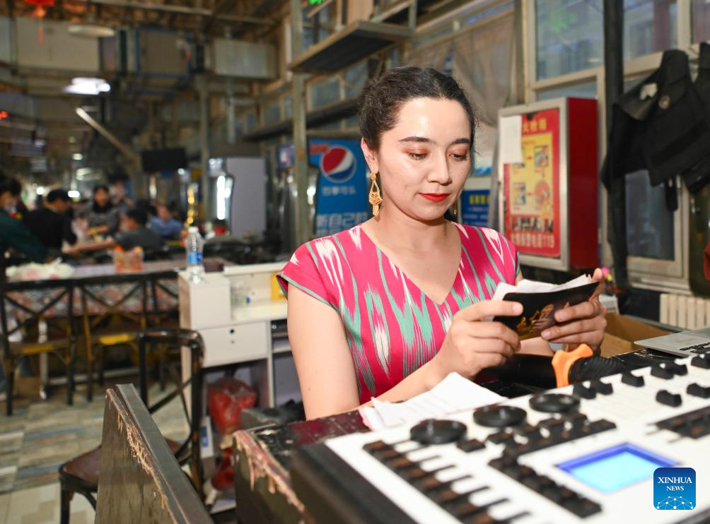 Nurbiye Jureait prepares to host a performance at the night market in Hotan, northwest China's Xinjiang Uygur Autonomous Region, April 16, 2025. The Hotan night market in Xinjiang, which integrates food, entertainment, and cultural features, is a popular destination for tourists. The Hotan cultural troupe holds artistic performances all year round at the night market to enhance the cultural life and tourism experience of local residents and visitors.