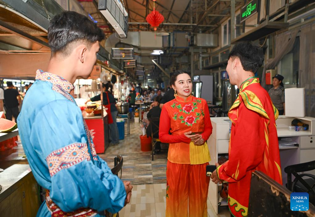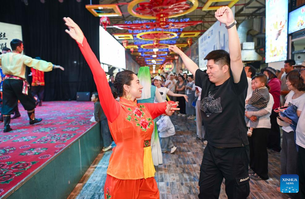 Nurbiye Jureait dances with a tourist at the night market in Hotan, northwest China's Xinjiang Uygur Autonomous Region, April 16, 2025. The Hotan night market in Xinjiang, which integrates food, entertainment, and cultural features, is a popular destination for tourists. The Hotan cultural troupe holds artistic performances all year round at the night market to enhance the cultural life and tourism experience of local residents and visitors.
