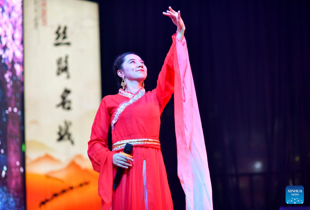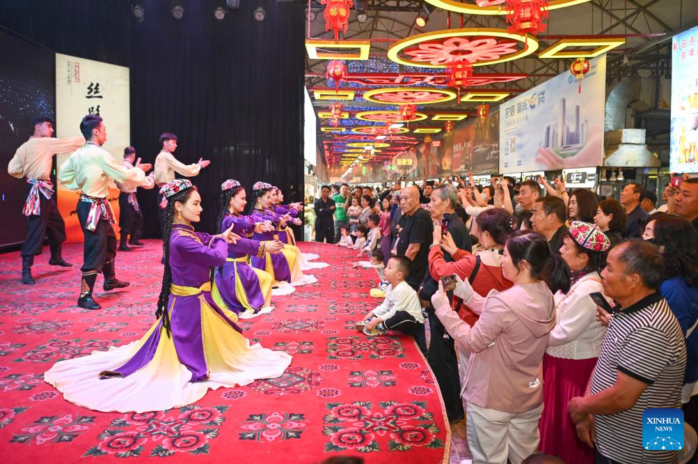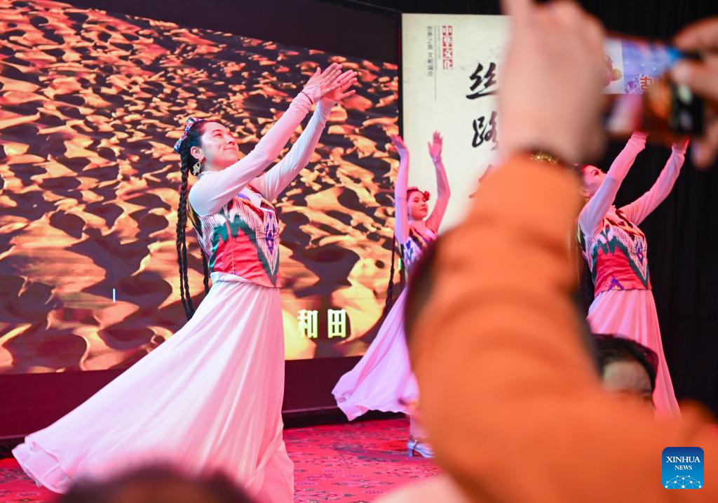 Nurbiye Jureait, along with more than ten colleagues, takes on performance duties, showcasing the rich and diverse cultural arts of Xinjiang through song and dance, while expressing admiration for the development and changes in Hotan. (Xinhua/Hu Huhu)