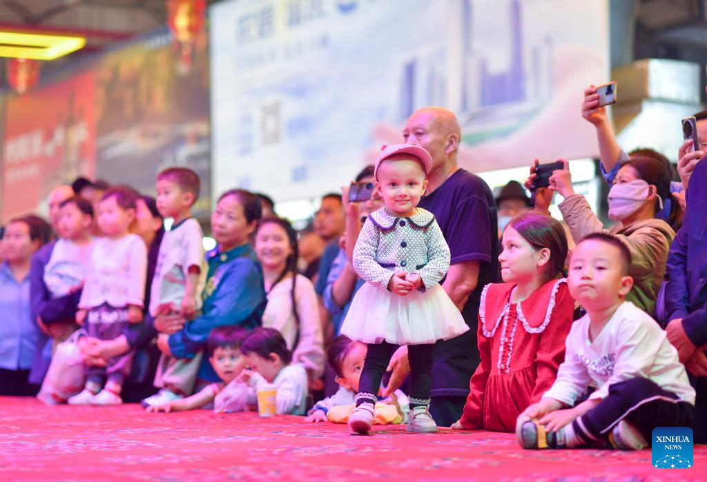 People watch a performance at the night market in Hotan, northwest China's Xinjiang Uygur Autonomous Region, April 15, 2025. The Hotan night market in Xinjiang, which integrates food, entertainment, and cultural features, is a popular destination for tourists. The Hotan cultural troupe holds artistic performances all year round at the night market to enhance the cultural life and tourism experience of local residents and visitors.