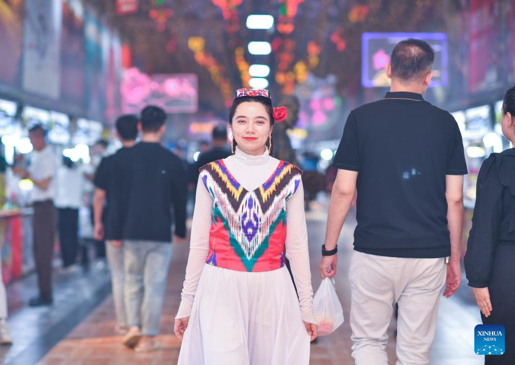 Nurbiye Jureait is pictured at the night market in Hotan, northwest China's Xinjiang Uygur Autonomous Region, April 16, 2025. The Hotan night market in Xinjiang, which integrates food, entertainment, and cultural features, is a popular destination for tourists. The Hotan cultural troupe holds artistic performances all year round at the night market to enhance the cultural life and tourism experience of local residents and visitors.