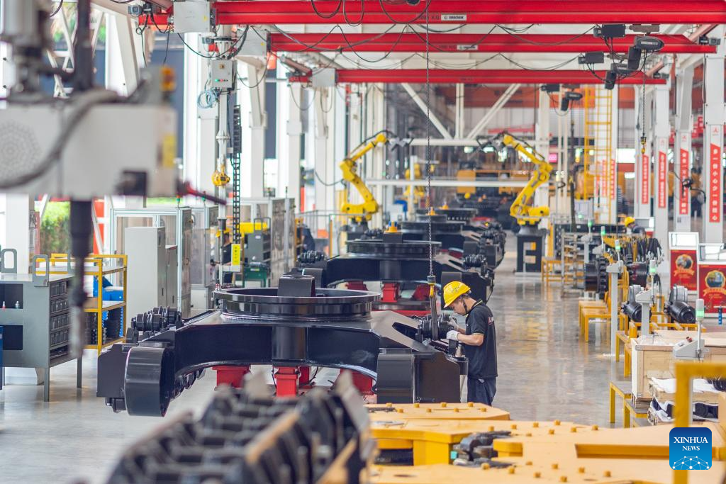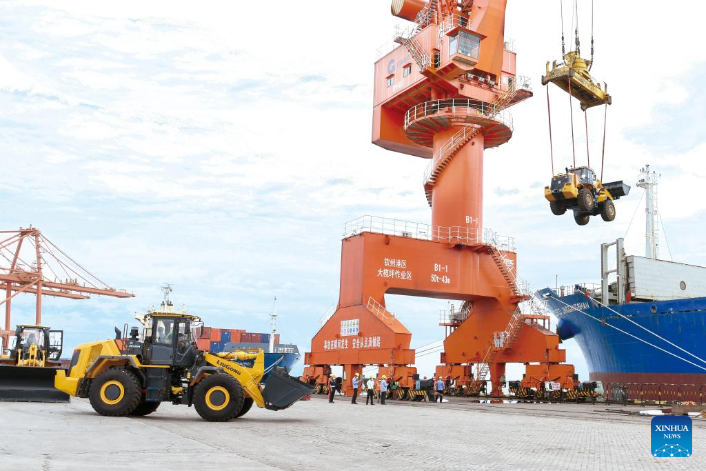 This photo taken on July 6, 2022 shows mechanical equipment produced at an equipment manufacturing company in Liuzhou for export via sea transportation at the Qinzhou Port in Qinzhou, south China's Guangxi Zhuang Autonomous Region. (Xinhua/Cao Yiming)
