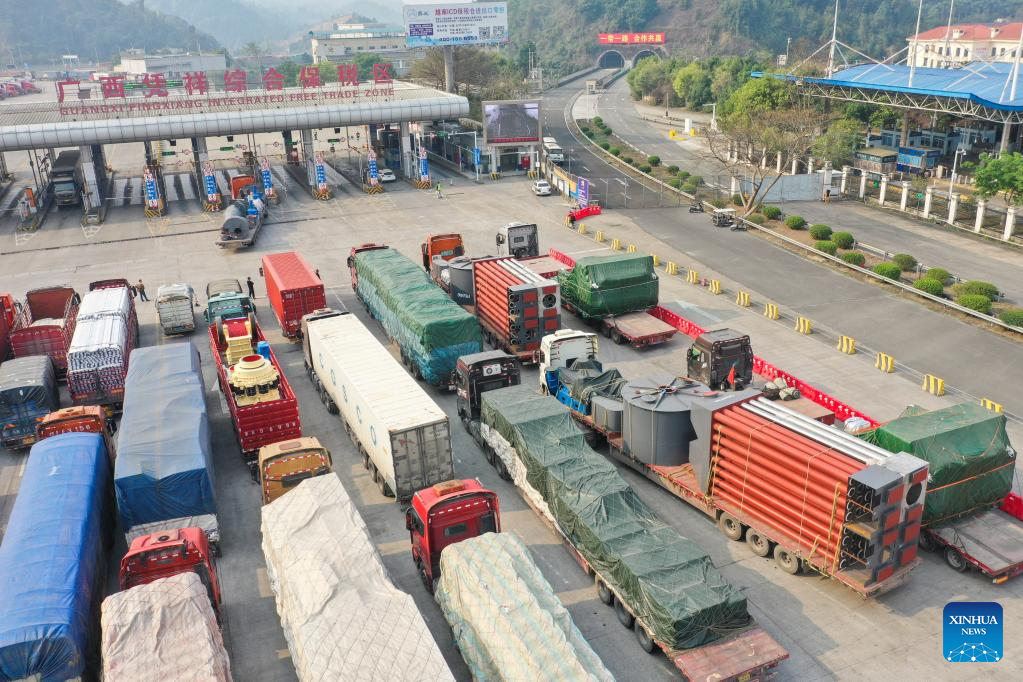 An aerial drone photo taken on March 21, 2025 shows trucks loaded with equipment for export to Vietnam in Guangxi Pingxiang Integrated Free Trade Zone in Pingxiang, south China's Guangxi Zhuang Autonomous Region. (Xinhua/Cao Yiming)