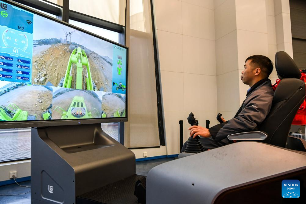 A staff member operates a loader through remote control at an equipment manufacturing company in Liuzhou, south China's Guangxi Zhuang Autonomous Region, March 12, 2025. (Xinhua/Cao Yiming)