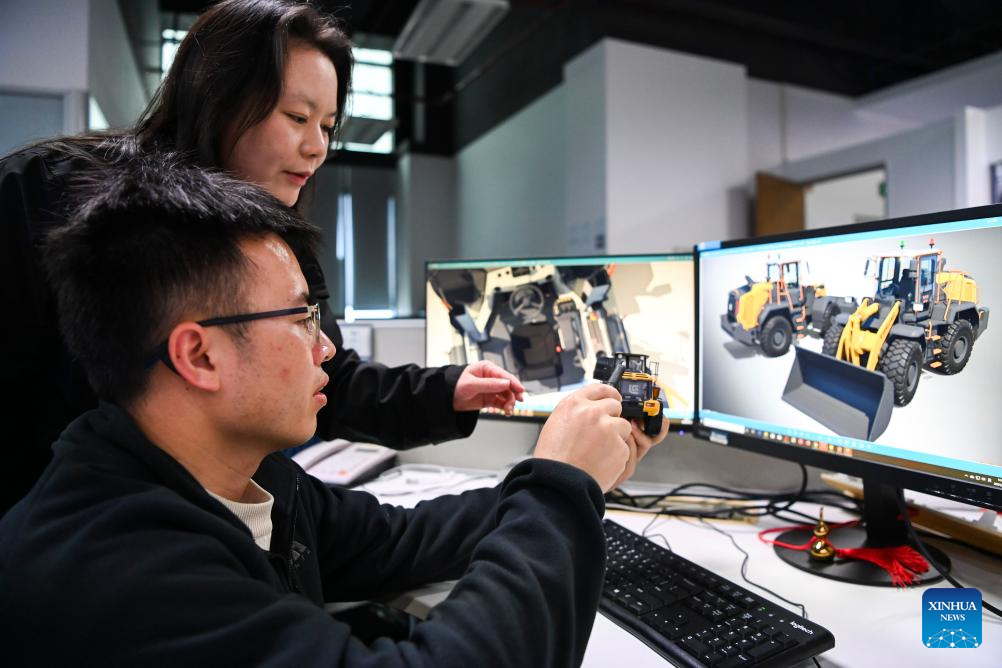 Staff members work on the design of equipment at an equipment manufacturing company in Liuzhou, south China's Guangxi Zhuang Autonomous Region, March 12, 2025. (Xinhua/Cao Yiming)