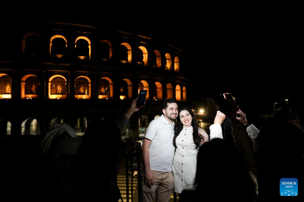 A couple poses for a photo with the Colosseum in Rome, Italy, during the Easter holiday on April 19, 2025. (Xinhua/Li Jing)