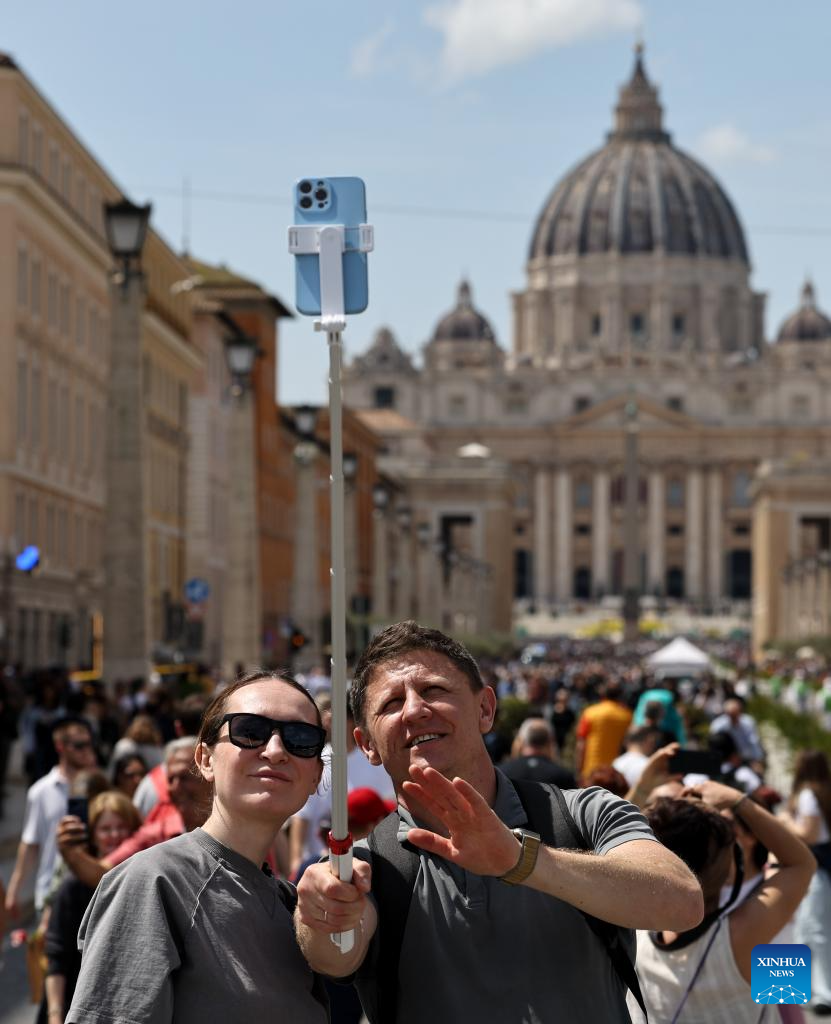 A couple poses for a selfie in Rome, Italy, during the Easter holiday on April 21, 2025. (Xinhua/Li Jing)