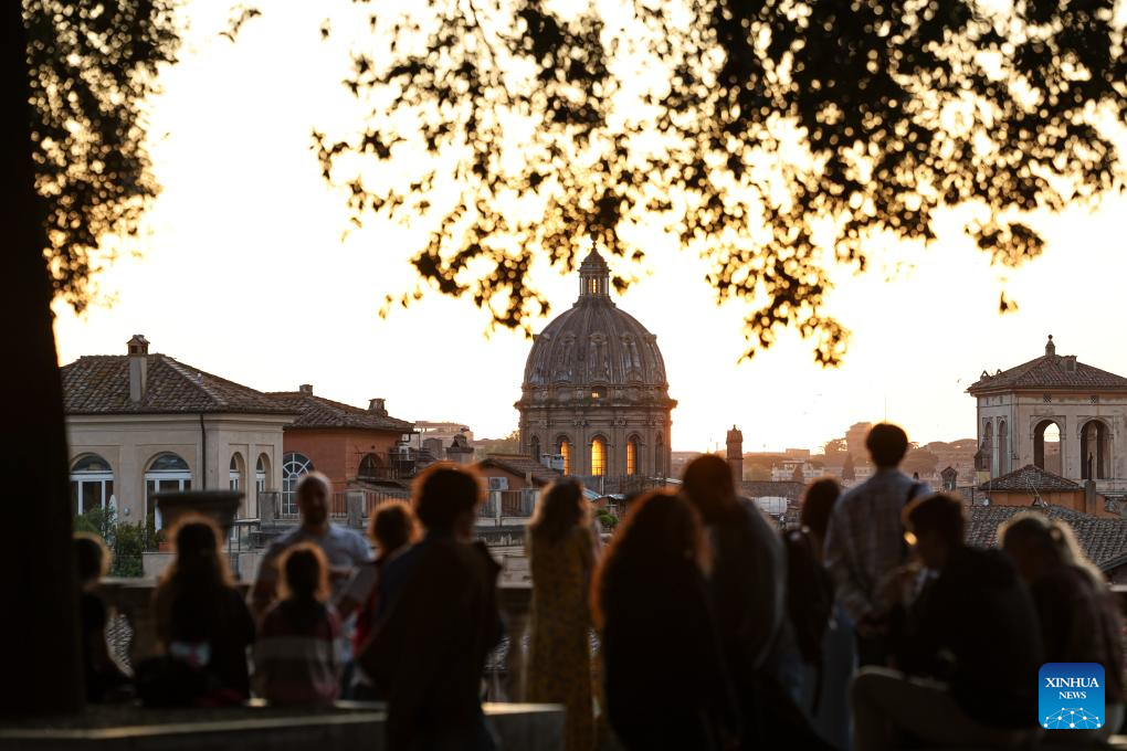 People watch the sunset in Rome, Italy, during the Easter holiday on April 21, 2025. (Xinhua/Li Jing)